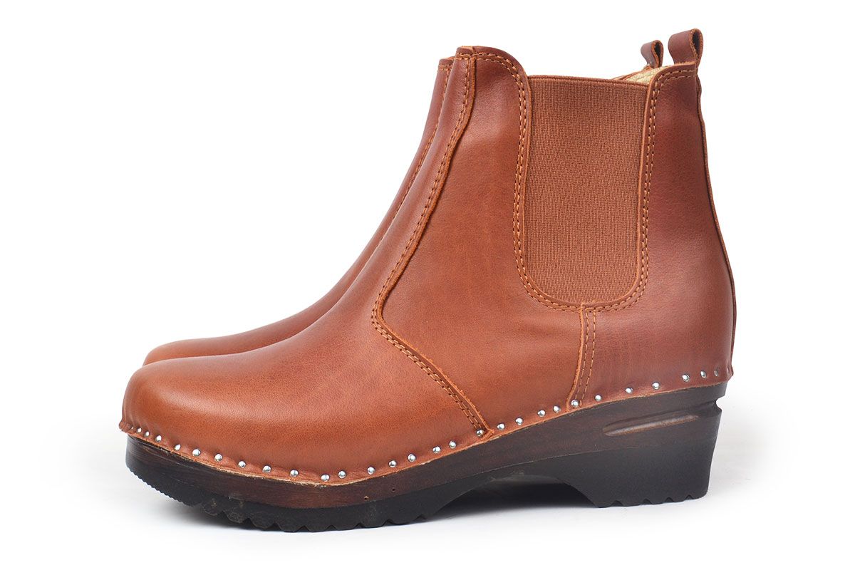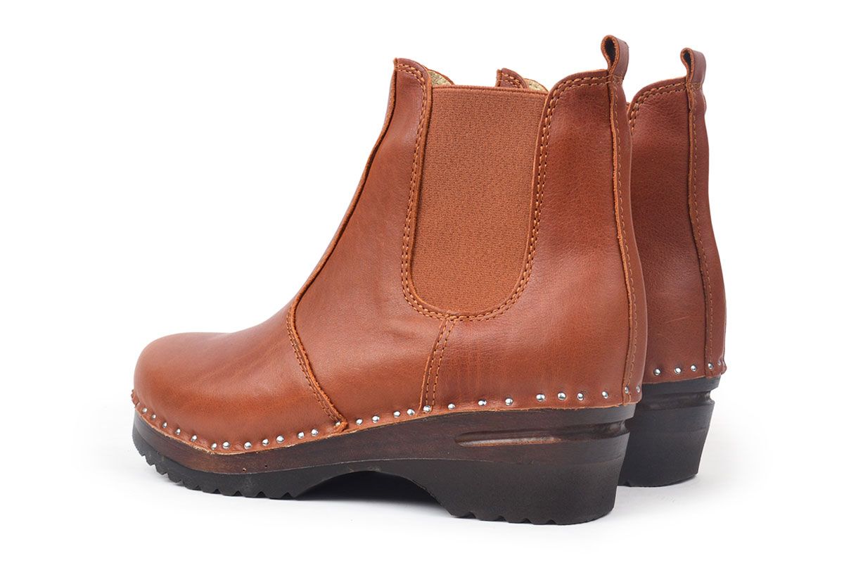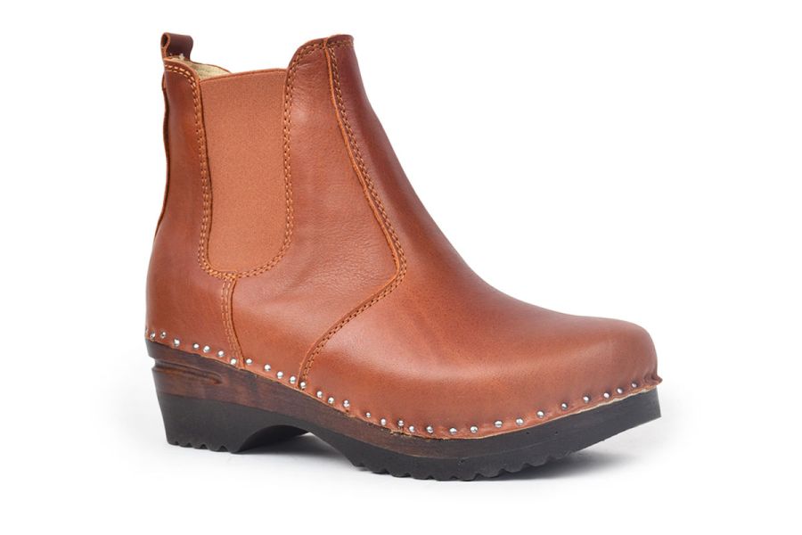 Chelsea clog boot with elastic on the sides in soft brown leather with leather lining.