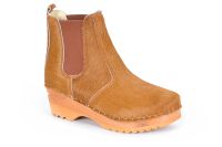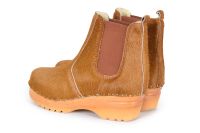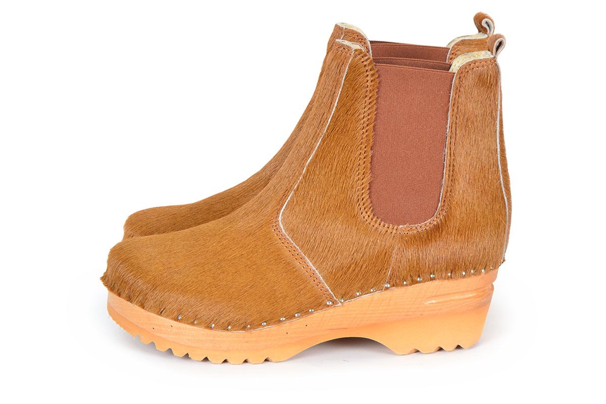 Chelsea clog boot with elastic on the sides in brown cow hair leather. Made on our varnished Ideal bottoms.
