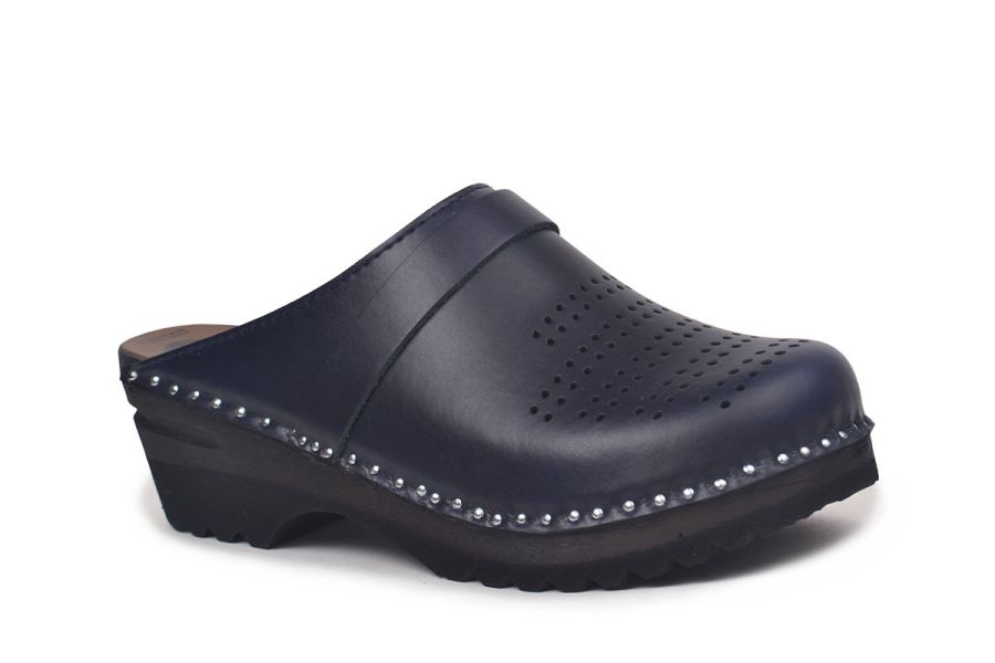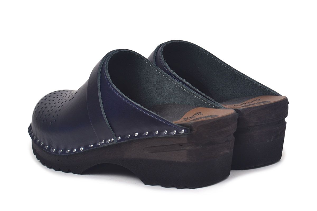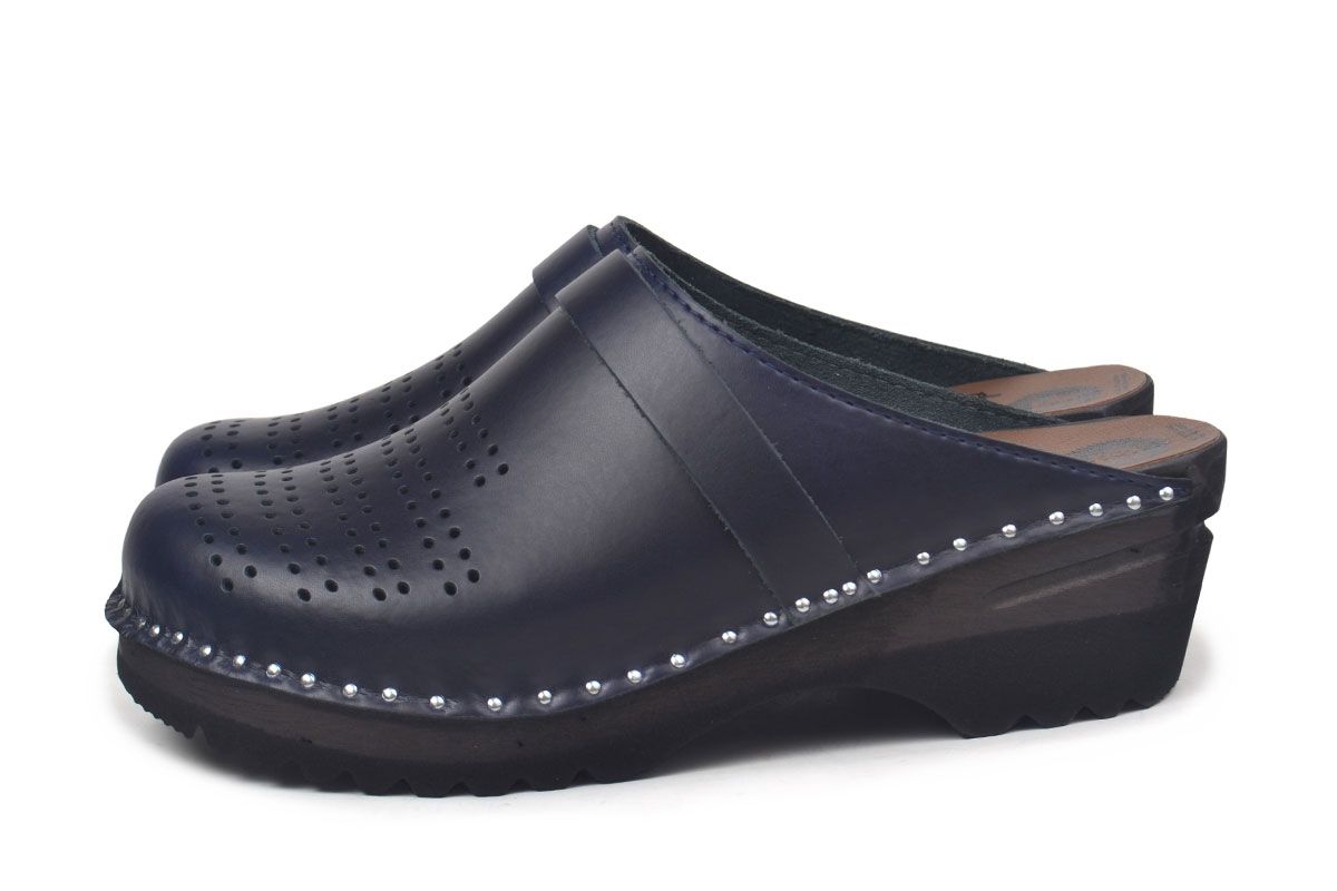 Clogs with simple strap and perforated instep in dark blue leather on a black wooden base.