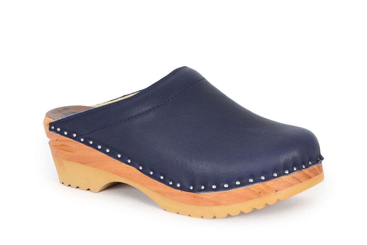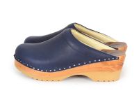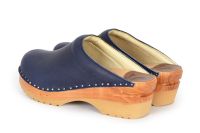 Clean Swedish clog design in blue vegetable tanned leather with chrome free leather lining. Made on our varnished Ideal wooden clog bottoms.