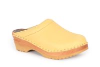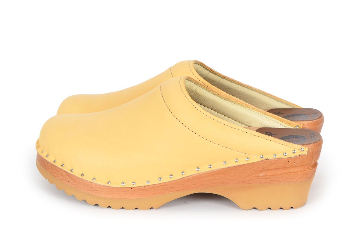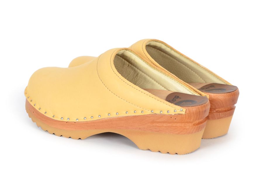 Clean Swedish clog design in natural vegetable tanned leather with chrome free leather lining. Made on our varnished Ideal wooden clog bottoms.