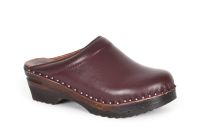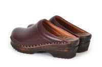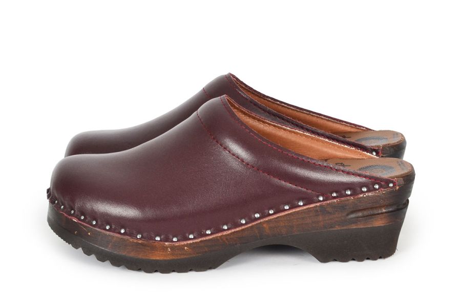 Clean Swedish clog design with a padded instep in wine leather with brown leather lining. Made on our brown Ideal bottoms.
