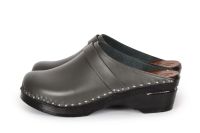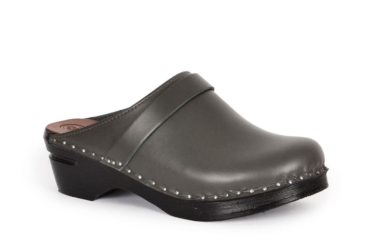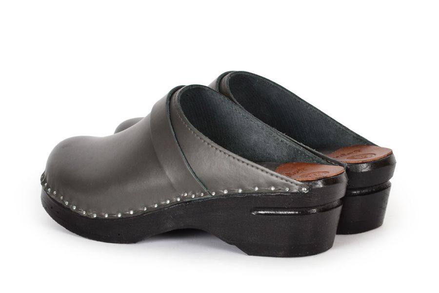 The Smithy clogs in smooth grey leather on black painted Original bottoms. Smithy was first produced in Troentorp in 1963 and is still one of our bestselling articles.