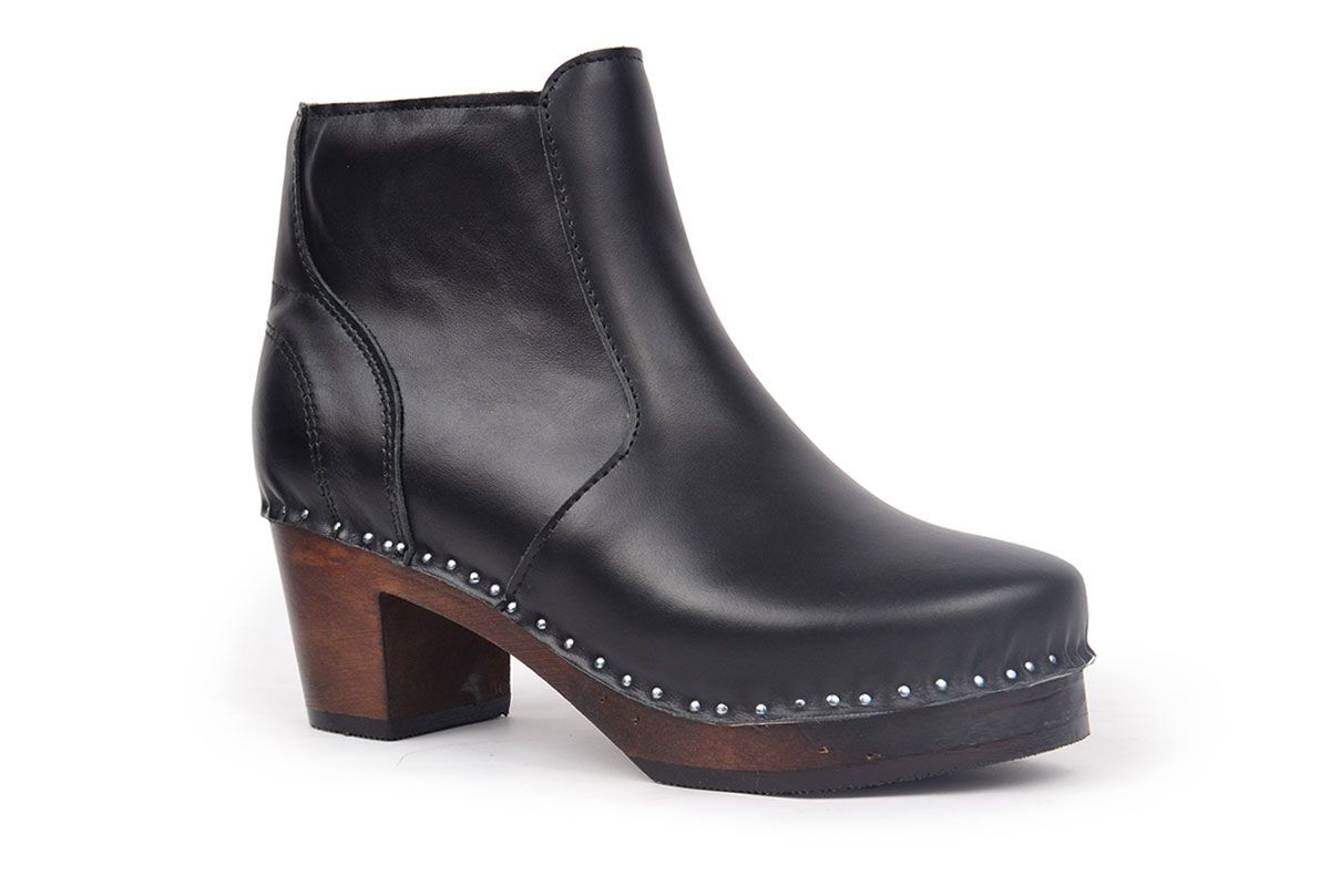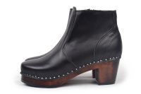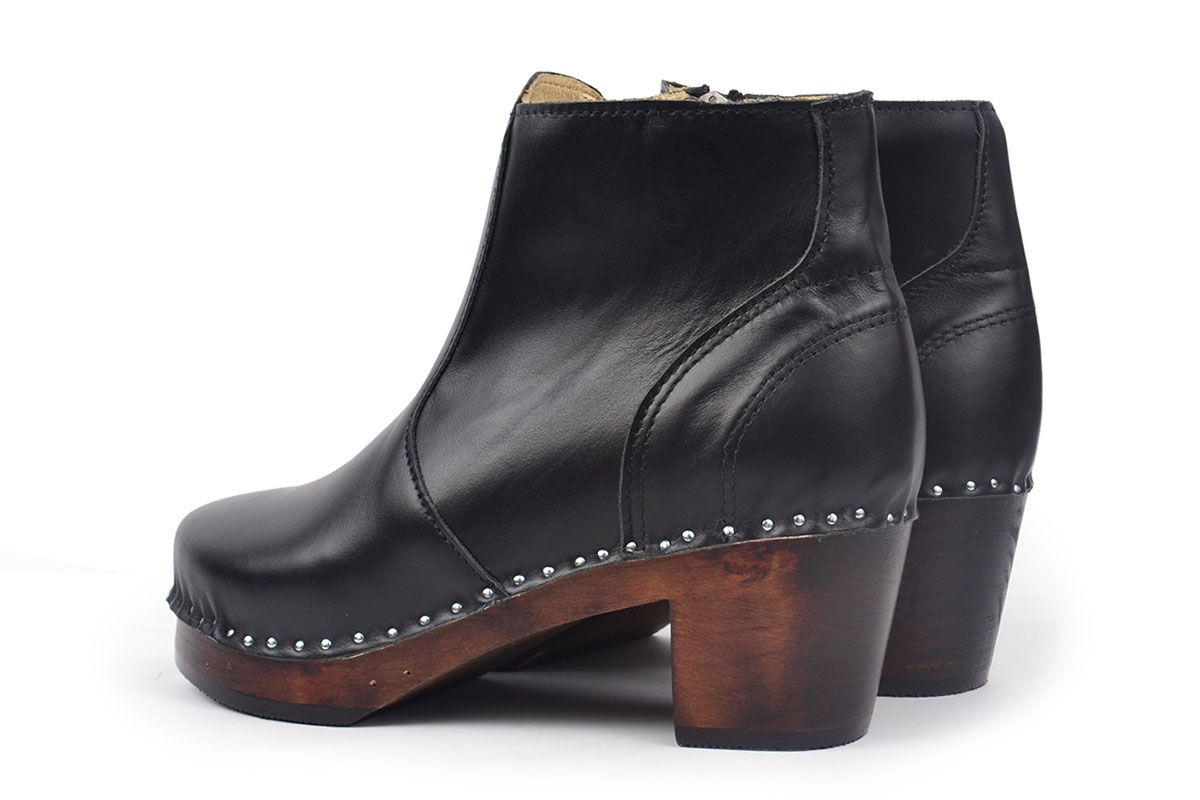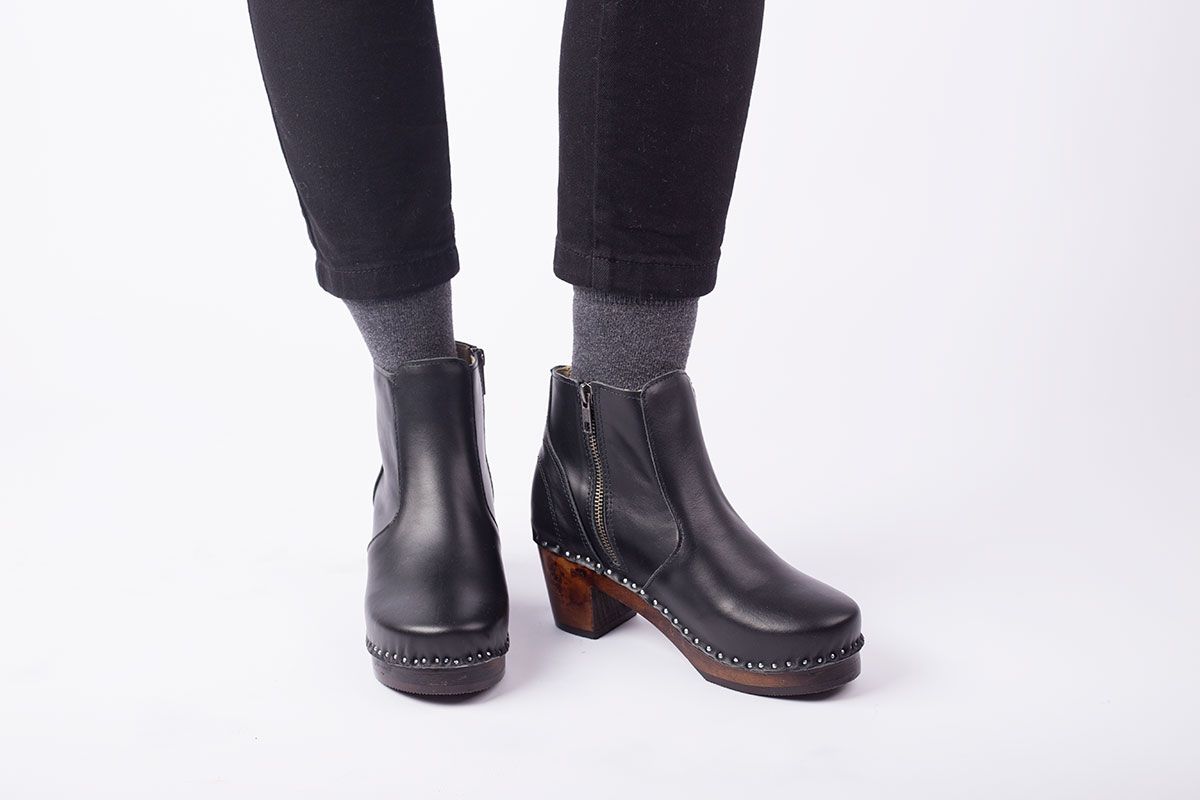 The Turner clog boot comes with a zipper on the inside and soft leather lining. Here in smooth black leather and on our brown stained and varnished Mid bottoms.