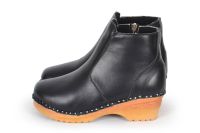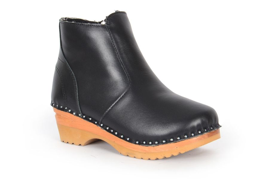 Turner shearling clog boot in black leather. This Troentorp clog boot comes with a zipper on the inside and with warm shearling lining for winter wear. Nailed onto our varnished Ideal bottoms.