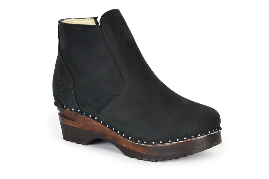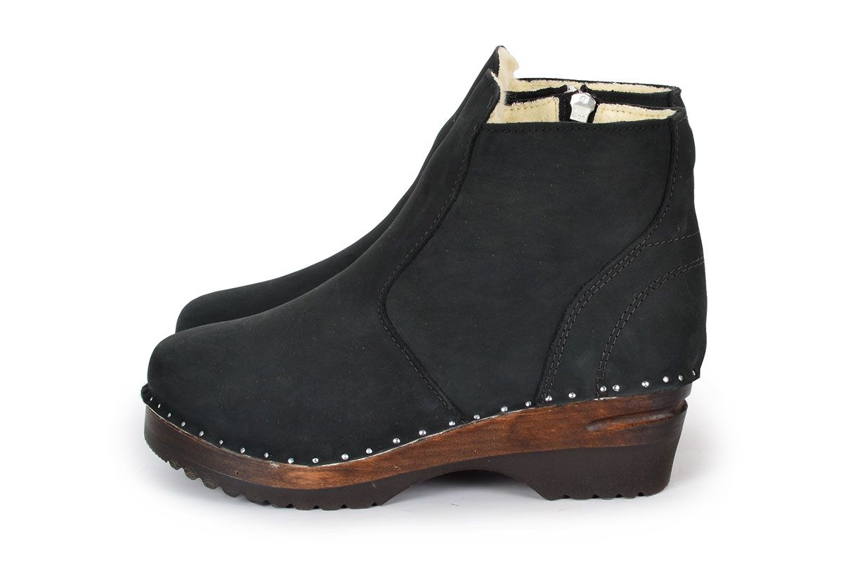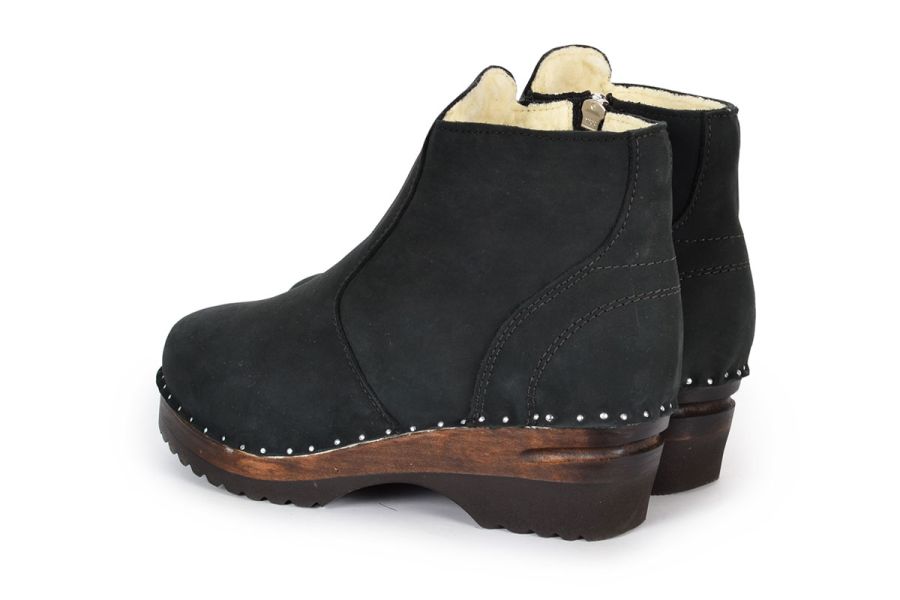 Shearling clog boot in waterproof black nubuck leather and with warm sheepskin lining on the footbed and a wool lined upper for winter wear. The Turner clog boot comes with a zipper on the inside and is made on our brown stained and varnished Ideal bottom.