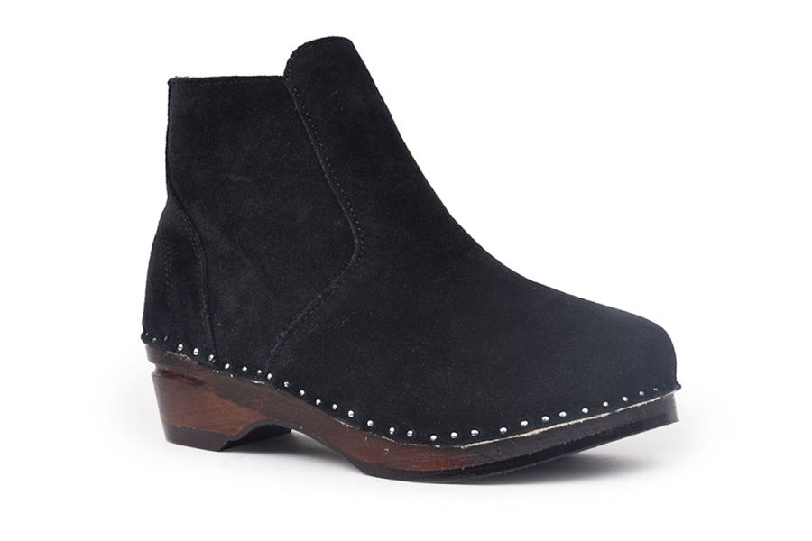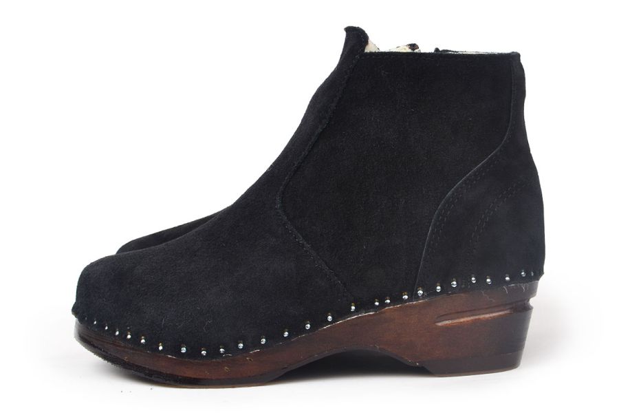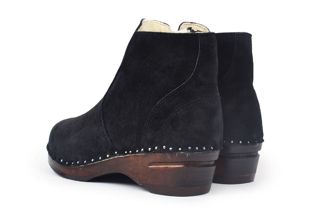 Shearling clog boot in black suede leather and with warm sheepskin lining on the footbed and a wool lined upper for winter wear. The Turner clog boot comes with a zipper on the inside made on our brown stained and varnished Original bottoms.