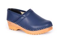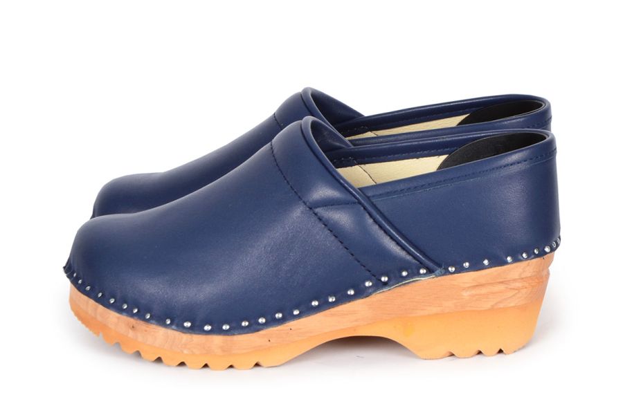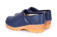 Closed back clog shoe in soft marine blue nappa leather and on our varnished Ideal bottoms.