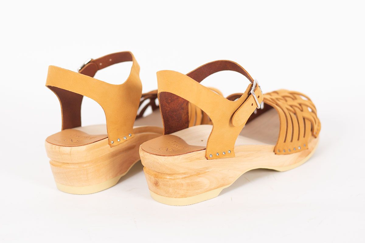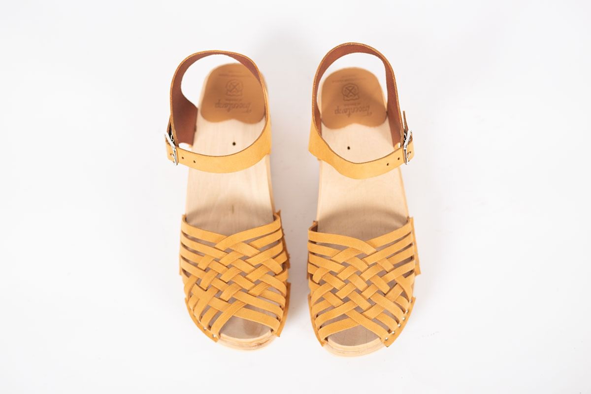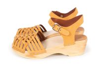 Clog Sandal with a braided front and adjustable ankle strap. Here in yellow nubuck leather on our varnished Original base.