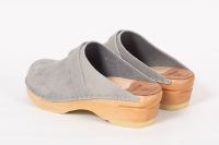 Classic Swedish clog style in light grey suede leather. Made on our varnished Original bottoms.
