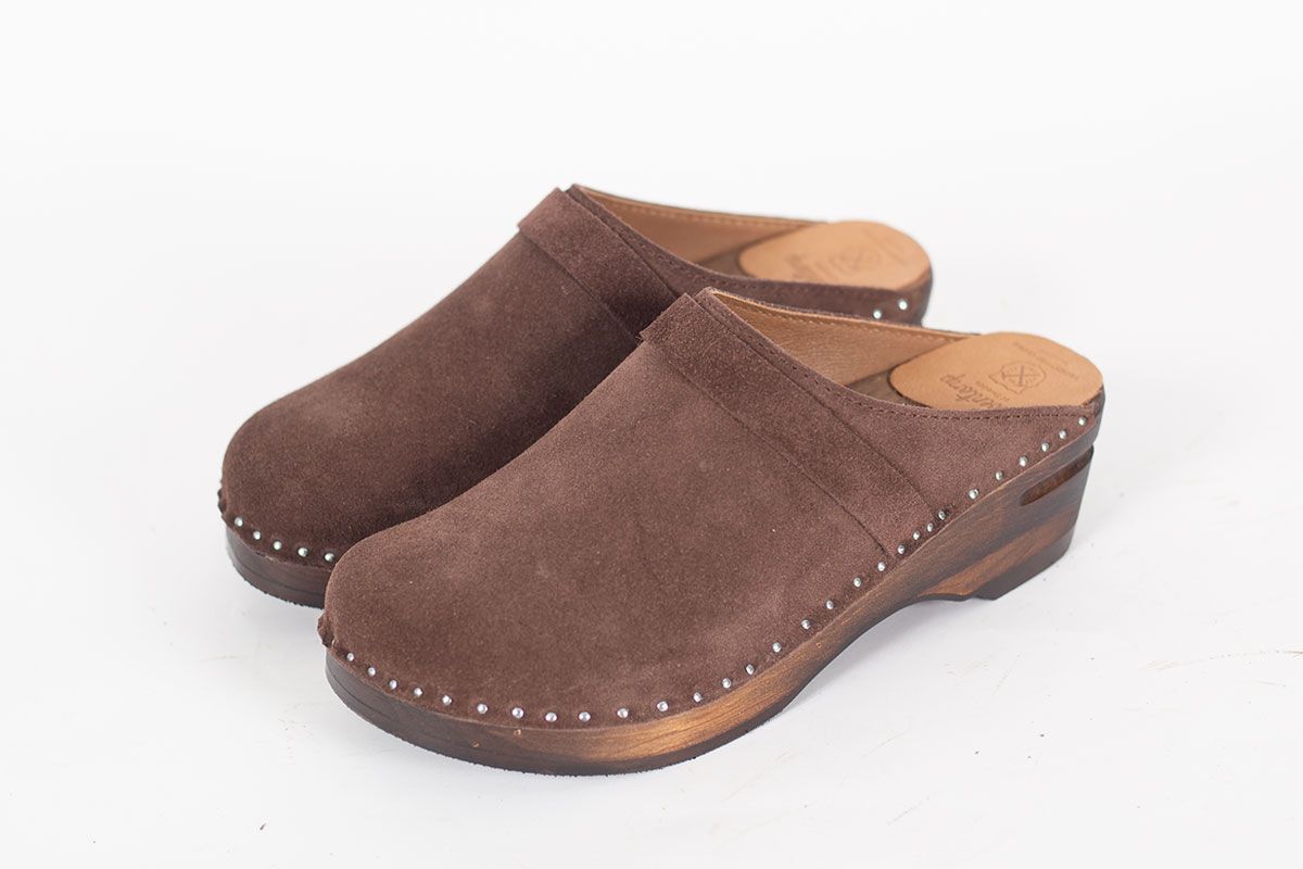 Classic Swedish clog style in brown suede leather with soft leather lining. Made on our brown Original wooden bottoms.