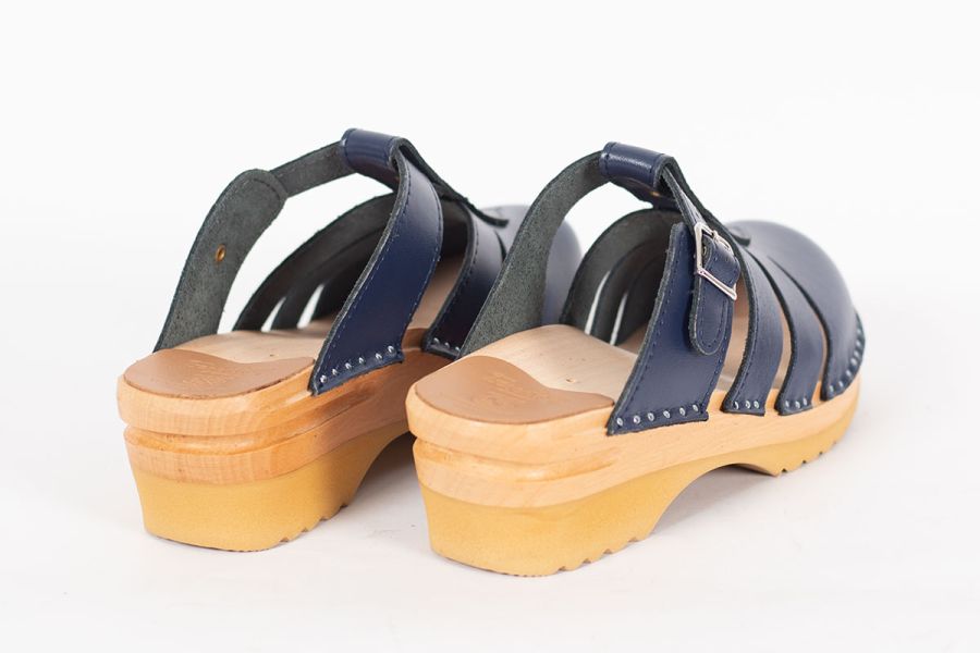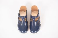 Clog sandal in dark blue leather with an adjustable strap over the instep and openings on the sides.