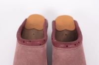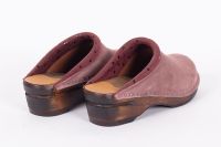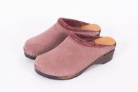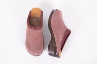 Classic Swedish clog style in mauve suede leather with printed leather covering the padded instep. Made on Troentorp's brown Original wooden bottoms.