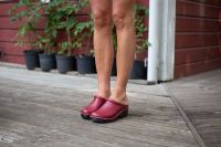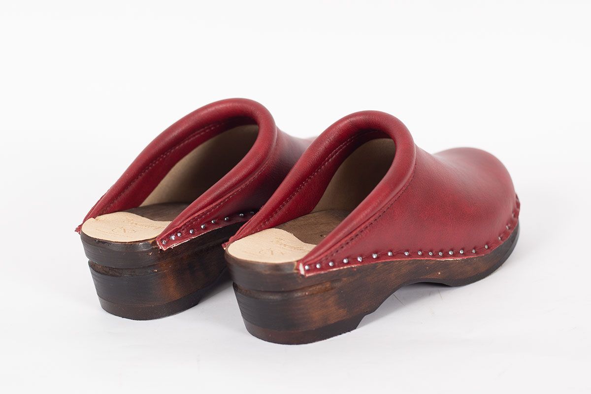 Classic Swedish clog design in red vegan leather with padding over the instep. Made on our brown stained and varnished Original bottoms.
