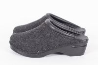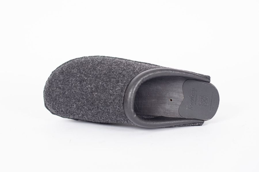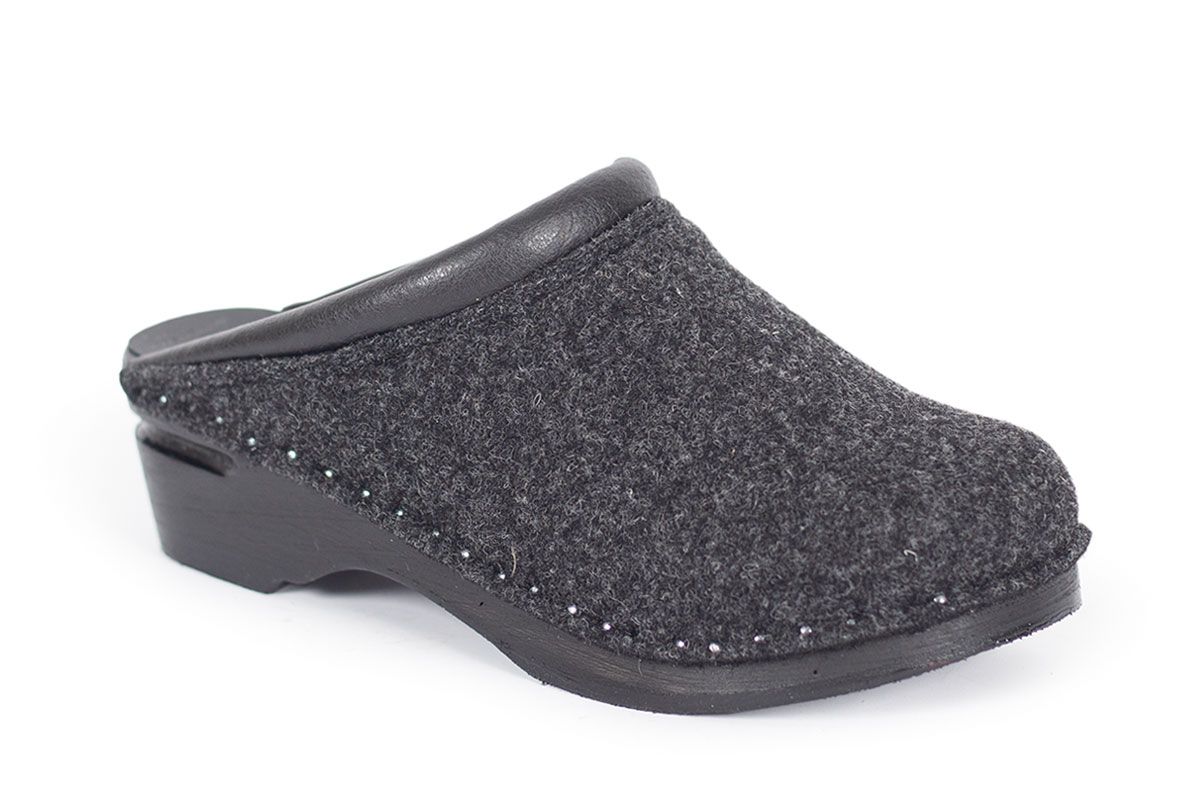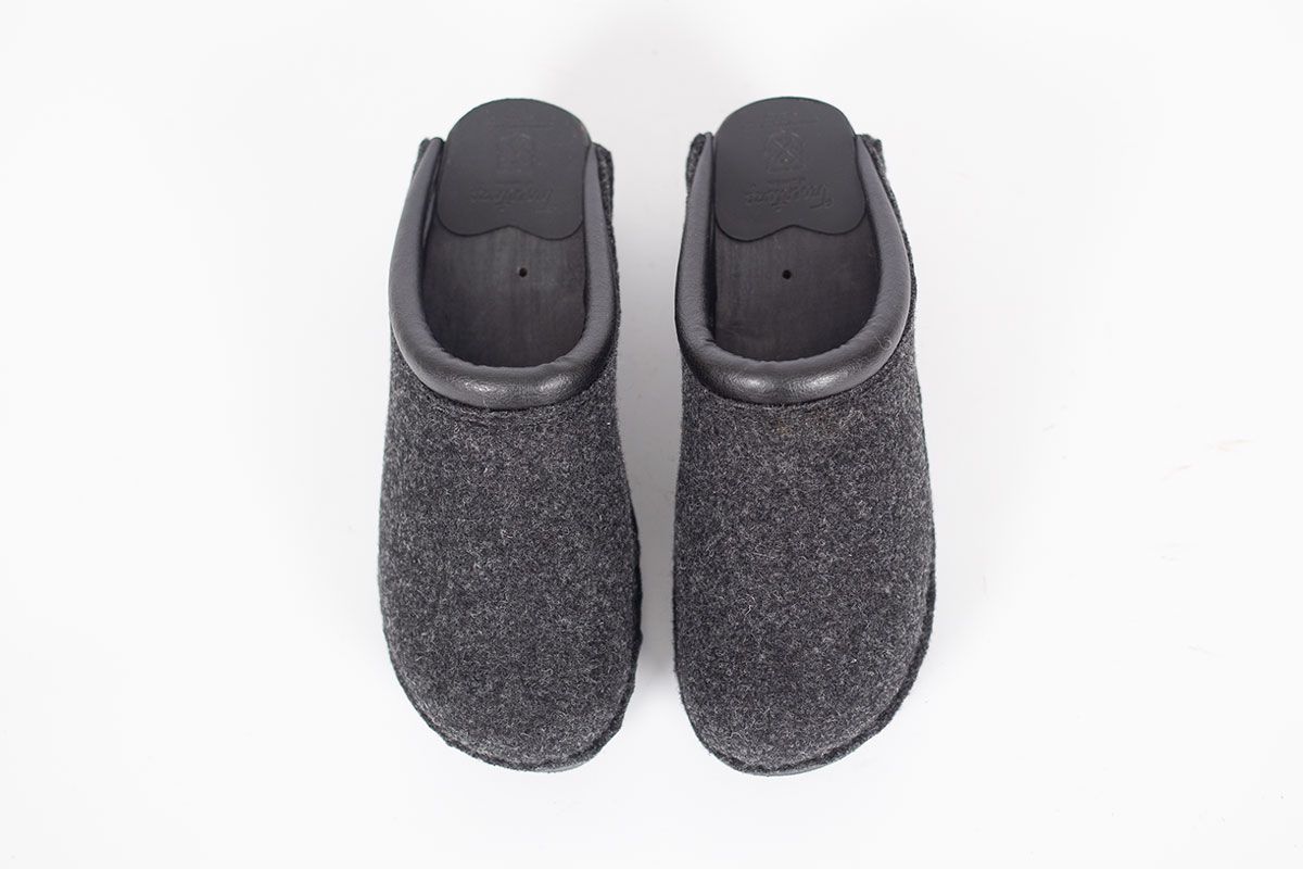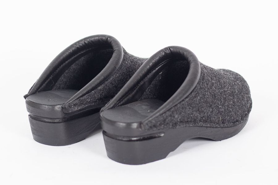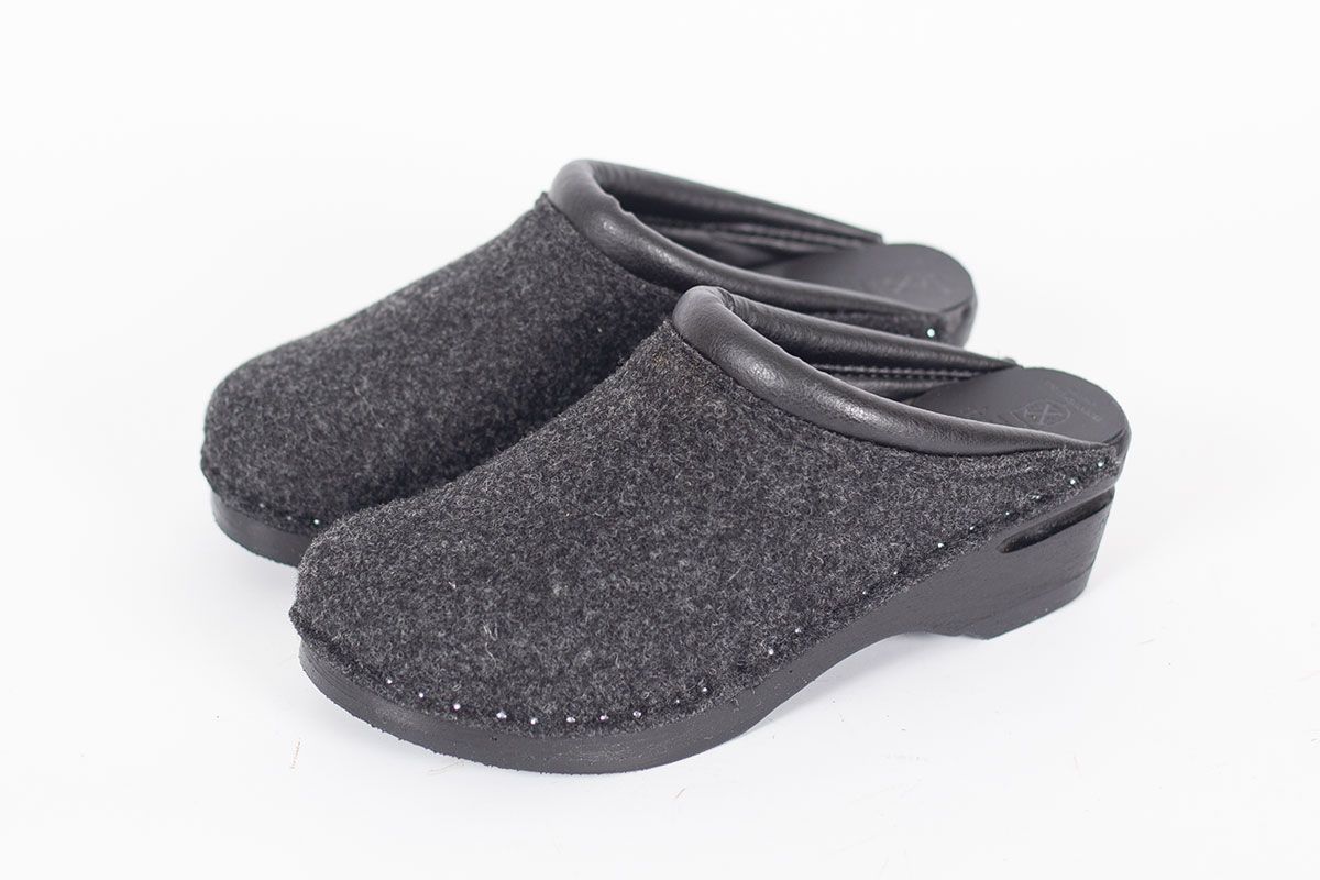 Classic Swedish clog style in grey felt designed in 1983. The felt is made in Italy and constructed of densely woven recycled wool fibers. Made on Troentorp's black stained and painted Original bottoms