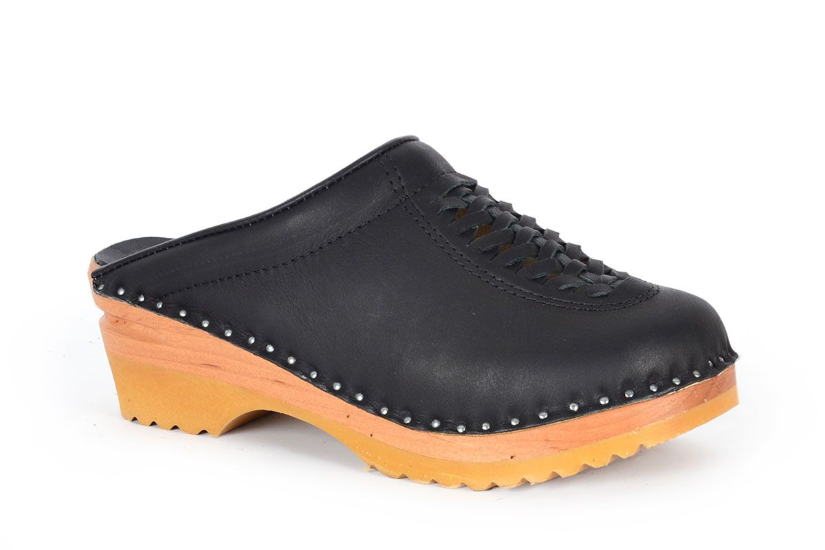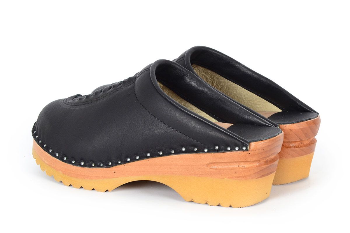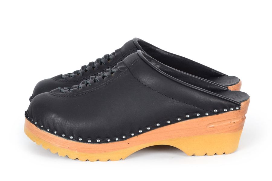 The Wright clogs designed in 1966 have a traditional braided front. Here the clogs come in black vegetable tanned leather and made on our Ideal wooden bottoms. This leather will age with a beautiful rich patina, giving a distinctive look to every pair of clogs. A protective coating has been applied to make it less sensitive, but as with all vegetable tanned leathers, it is best to to try and avoid exposure to water and other liquids.