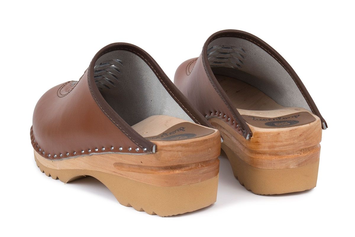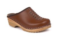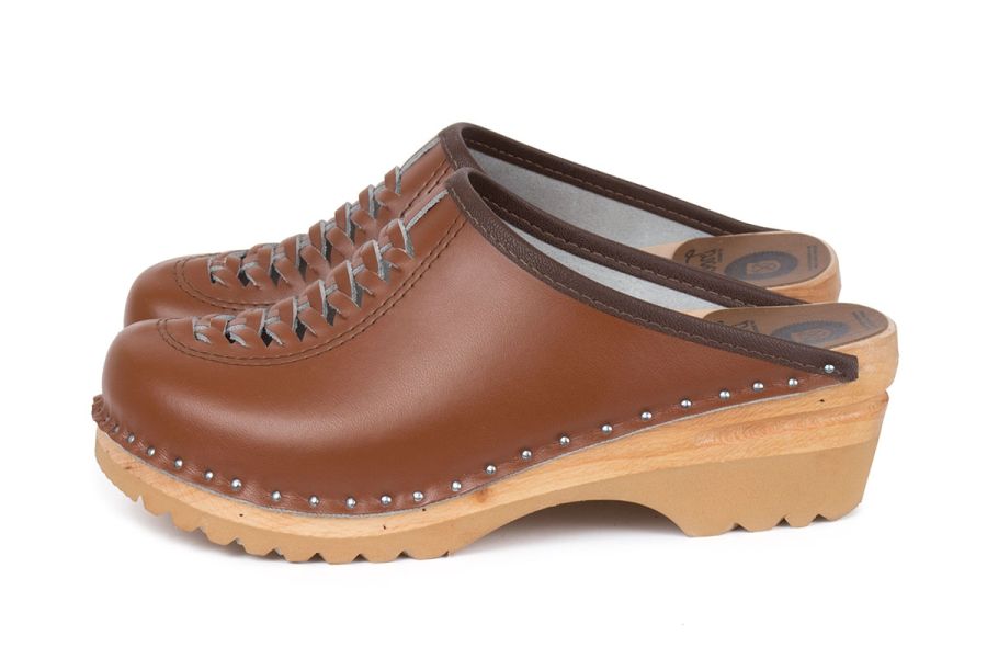 The Wright clogs designed in 1966 have a traditional braided front. Here the clogs come in brown leather and made on our ideal wooden clog bottoms.